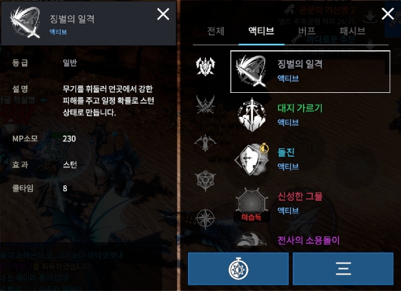 징벌의 일격은 초반 튜토리얼에서 얻을 수 있는 기본 스킬이다. 쿨타임 8초에 MP 230을 소모하며 기본적으로 적중 시 일정 확률로 상대방에게 스턴을 거는 효과가 있다. 여러 연계 스킬을 통해 유용하게 초반부터 후반까지 유용하게 사용할 수 있는 스킬이다.