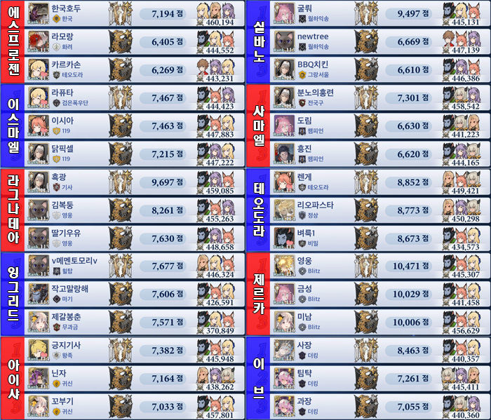 1위는 제르카 서버의 '영웅' 유저로 동서버 2위와 약 250점 차이로 1위를 확정 지었다. 라그나데아의 '흑광' 유저와 실바노의 '굴뤄' 유저는 경쟁과 상관없이 1만 점 가까운 점수를 획득하며 고득점 단골답게 큰 점수를 획득한 상태. 이 외에도 테오도라의 '렌게' 유저, 이즈의 '사장' 유저도 8천 점을 넘기며 고득점 서열에 이름을 올렸다.