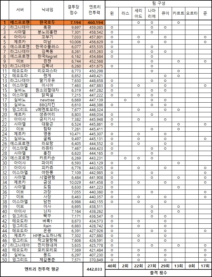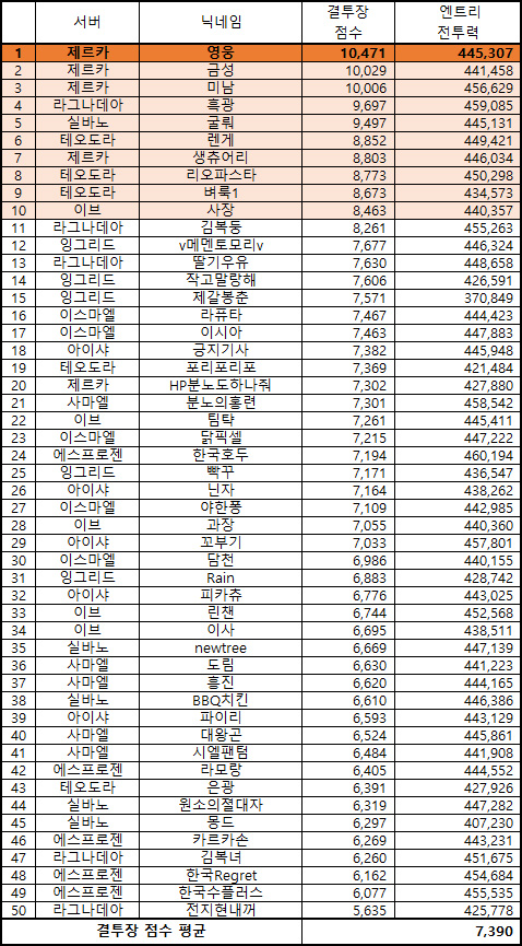 각 서버별 결투장 점수 기준 TOP 5를 모은 후 엔트리 전투력 기준으로 나열한 전 서버 TOP 50위 유저들의 모음이다.