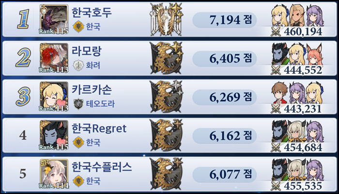 * 전투력 등 각종 순위는 결투장 랭킹 TOP5에 입성한 게이머 기준이므로 누락된 게이머가 있을 수 있습니다.*