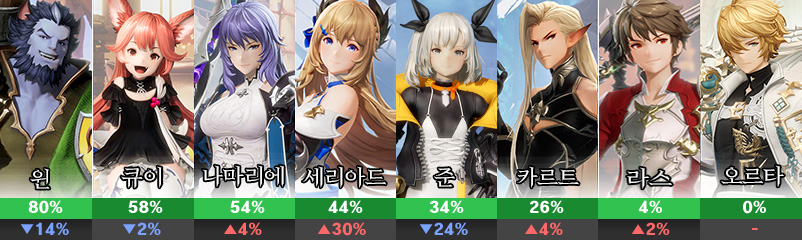 항상 믿고 찾는 나마리에는 소폭 상승해 큐이와 거의 차이 없는 3위에 랭크. 반대로 준은 세리아드의 반등에 가장 큰 타격을 입어 24%나 하락하며 5위까지 추락했다. 카르트는 나름대로 선방했지만 여전히 찾는 이가 점점 줄어들고 있는 형국이다. 4% 하락해 26%를 기록, 6위에 랭크됐다.
