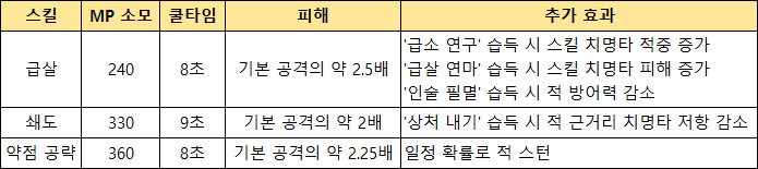 이에 어쌔신이 가장 무난하게 획득할 수 있는 기본 지급 스킬 급살과 쇄도를 포함해 어쌔신의 희귀 등급 액티브 스킬 '약점 공략'까지 액티브 스킬 3종을 서로 비교해보았다.