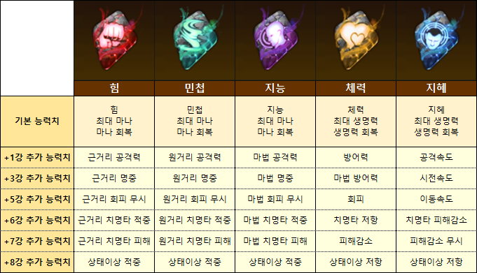 체력의 엘룬은 방어력, 회피, 치명타 저항, 피해감소, 상태이상 저항 등 전형적인 방어 계열 보조 능력치가 생기지만 지혜의 엘룬은 공격속도, 시전속도, 이동속도, 피해감소 무시 등 공격적인 능력치가 생긴다. 특히 피해감소 무시는 매우 공격적인 능력치임에도 다른 엘룬에는 붙지 않는 능력치기 때문에 더욱 가치가 높다.