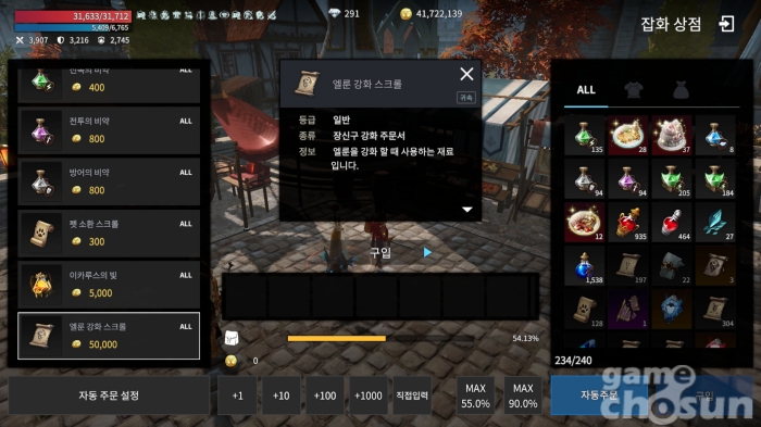 마을의 잡화점에서 강화 스크롤을 구매할 수 있다 = 게임조선 촬영