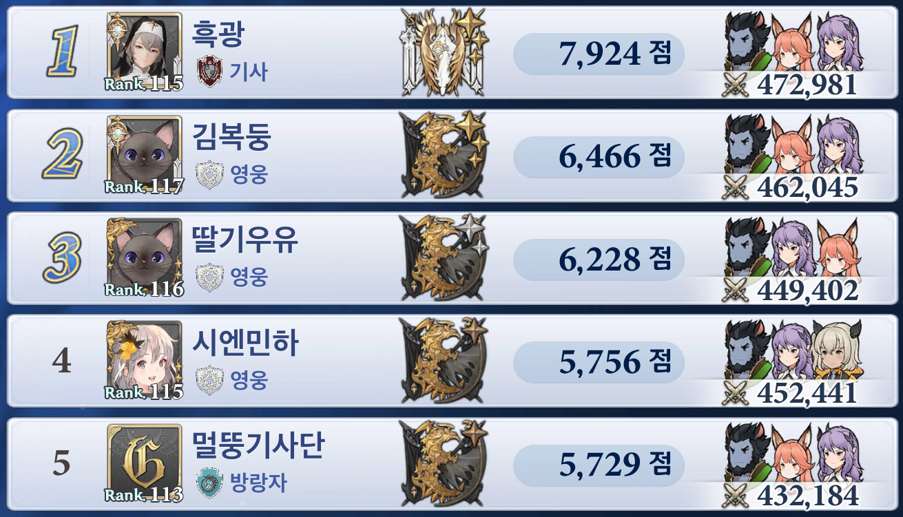 * 전투력 등 각종 순위는 결투장 랭킹 TOP5에 입성한 게이머 기준이므로 누락된 게이머가 있을 수 있습니다.*