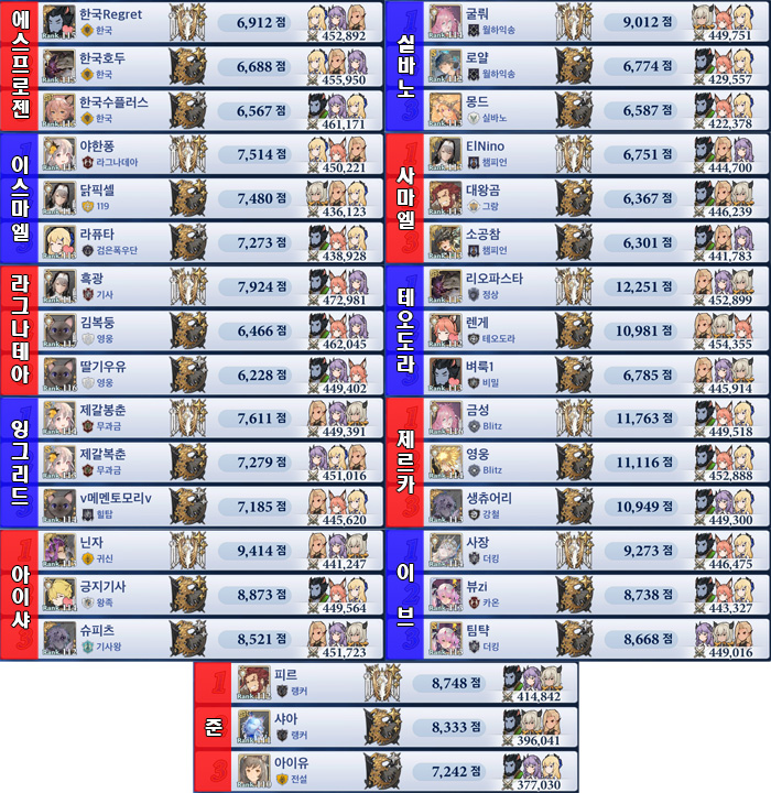 11서버 준이 장족의 성장을 거두며 기존 서버와 어깨를 나란히 하는 수준까지 올라왔다. 아직 동일한 수준까지는 아니지만 어깨를 나란히 할만한 수준은 된다고 판단되는 바 금주부터 준서버도 시존 서버와 동일 선상에서 집계를 시작하게 됐다.