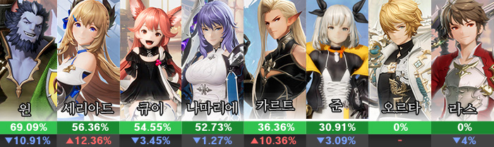 독보적 1위였던 윈은 지금도 1위지만 10.91% 하락해 69.09%까지 하락했다. 반면 세리아드와 카르트는 각각 12.36%와 36.36% 상승해 각각 2위(56.36%)와 5위(36.36%)에 랭크 중. 전통의 인기 딜러 큐이와 나마리에는 선택률이 소폭 하락했지만 50%가 넘는 선택률을 보이며 3위(54.55%)와 4위(52.73%)를 유지하고 있다.