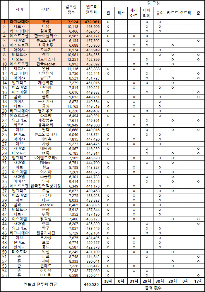 각 서버별 결투장 점수 기준 TOP 5를 모은 후 엔트리 전투력 기준으로 나열한 전 서버 TOP 50위 유저들의 모음이다. 해당 집계 방식은 금주까지만 사용하며 17주 차부터 통합 랭킹에서 제공하는 자료를 기준으로 작성할 예정이다.