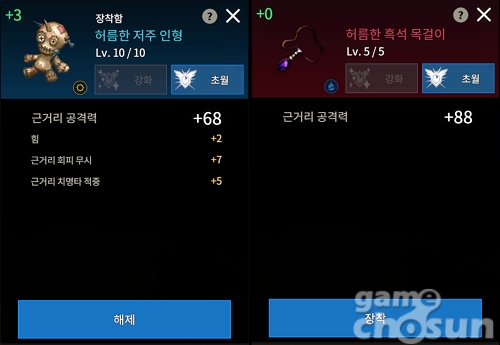 겉으로 보이는 주 옵션은 초월 2단계 '허름한 저주 인형'이 공격력 68, 영웅 등급 초월 0단계 '허름한 흑석 목걸이'가 공격력 88로 영웅 등급 쪽이 높지만 추가 능력치 힘 2를 포함해 계산하면 허름한 저주 인형을 장착했을 때 약 92~93의 공격력을 얻을 수 있다. 공격력 외에도 힘을 올렸을 때 얻는 다른 보조 능력치를 생각하면 전투에서 효율 격차는 더욱 벌어진다.