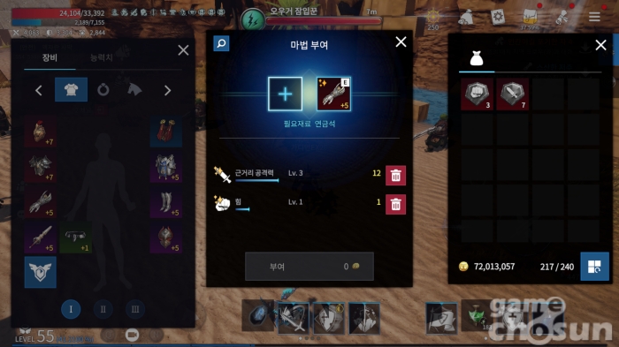 마법 부여는 영웅 등급 이상 장비에 추가 옵션을 직접 추가할 수 있는 기능으로 꾸준한 사냥을 통해 연금석을 수급할 수 있어 레벨 상승은 힘들더라도 부여 자체는 꾸준히 플레이했다면 시도할 수 있는 경우가 많다.