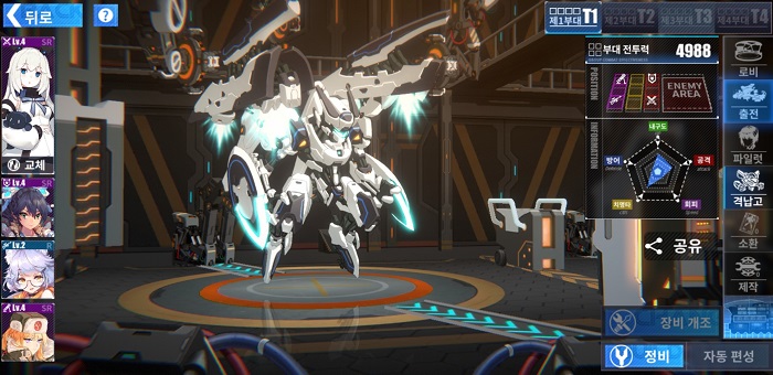 격납고에서는 파츠를 활용한 메카 커스터마이징과 스탯 향상을 위한 장비 강화, 부대 편성, 부대 전투력 확인, 캐릭터별 전투력 상세 정보 확인, 장비 개조 등 다양한 작업을 진행할 수 있다.