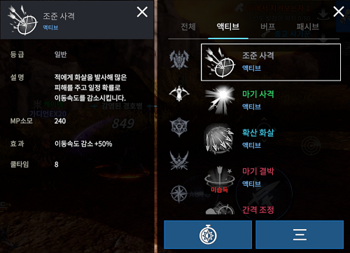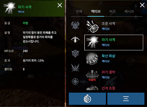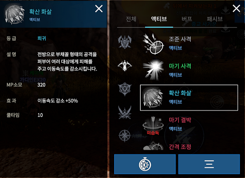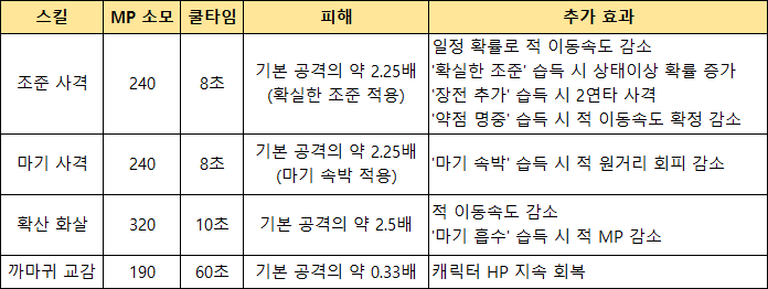이에 레인저가 가장 무난하게 획득할 수 있는 기본 지급 스킬 조준 사격과 마기 사격을 포함해 레인저의 희귀 등급 액티브 스킬 '확산 화살'과 '까마귀 교감'까지 공격 스킬 4종을 서로 비교해보았다.