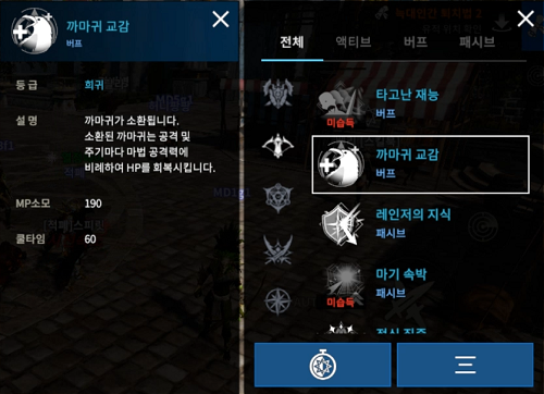 여기에 까마귀 교감은 소환되어 있는 동안 마법 공격력에 비례해 레인저의 HP를 지속해서 회복시키는 효과가 있다. 연계 스킬 '재주 부리기'를 습득 시 회복량이 원거리 공격력 비례로 변경되며 공격력 증가, 쿨타임 감소까지 제공해 준다.