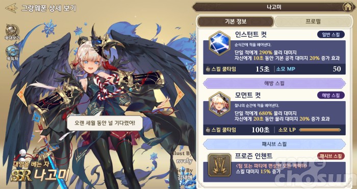 '나고미'는 아군의 스킬 대미지를 증가시키는 '프로즌 인첸트' 패시브로 카이토뿐만 아니라 파티 전체의 대미지를 높여주는 유용하게 사용된다. 액티브 스킬 '인스턴트 컷'과 '모먼트 컷'은 단일 적에게 물리 피해를 주고, 자신의 물리 대미지를 증가시켜주기 때문에 화력 상승이 필요할 때 찾게 되는 그랑웨폰이다.