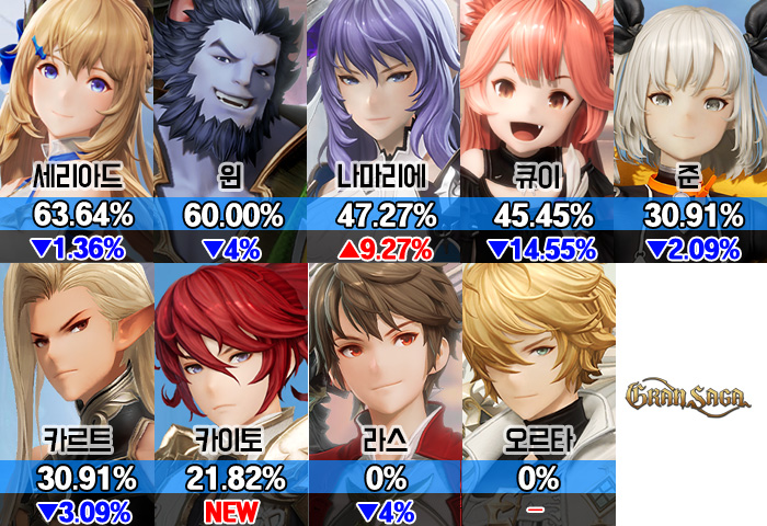 캐릭터 선택 부문은 카이토가 새롭게 등장한 것과 큐이와 나마리에가 순위를 바꾼 것을 제외하면 큰 변화는 없는 편. 여전히 세리아드와 윈이 선택률이 소폭 하락했지만 60%가 넘는 선택률을 보이며 압도적 1, 2위를 차지하고 있는 중이다. 선택률 하락 원인도 인기가 떨어졌다기보다 신규 캐릭터 카이토의 등장에 따른 하락으로 보는 것이 합리적인 수준.