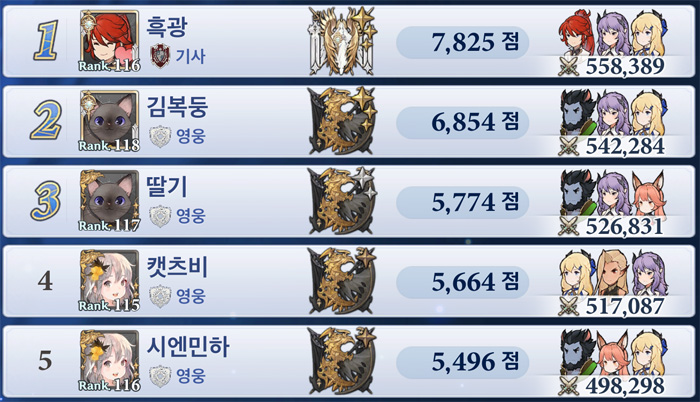 * 전투력 등 각종 순위는 결투장 랭킹 TOP5에 입성한 게이머 기준이므로 누락된 게이머가 있을 수 있습니다.*