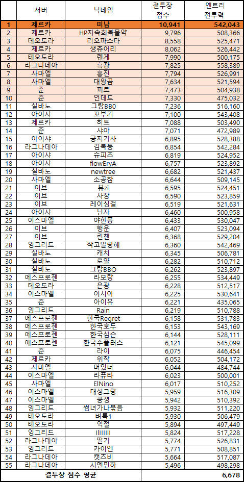◆ 전체 서버별 결투장 점수 TOP 55 = 결투장 점수순 정렬
