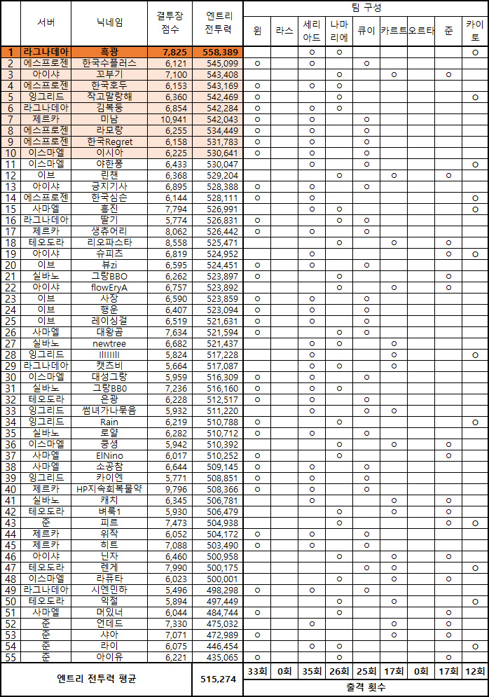 ◆ 전체 서버별 TOP 55 = 엔트리 전투력 순 정렬