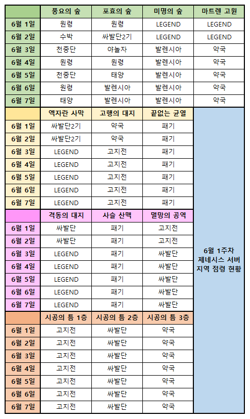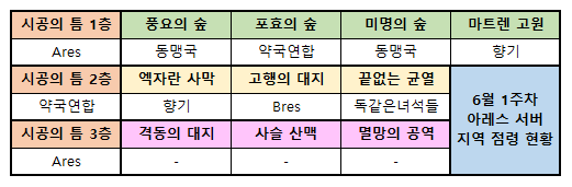 이번 주는 점령 길드 현황 변동이 유의미하게 있었다. 비록 시공의 틈 세 곳은 여전히 세 개 길드가 꽉 쥐어 잡고 있는 상황이나 하위 지역의 경우 조금씩 바뀌었으며 특히 풍요의 숲의 경우 매일 점령한 길드가 바뀔 정도로 치열하게 경쟁이 일어났다.