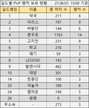 ※ 점령 현황은 매일 오후 3시, PvP 랭킹은 월요일 오후 3시에 집계한 기준임을 알려드립니다.