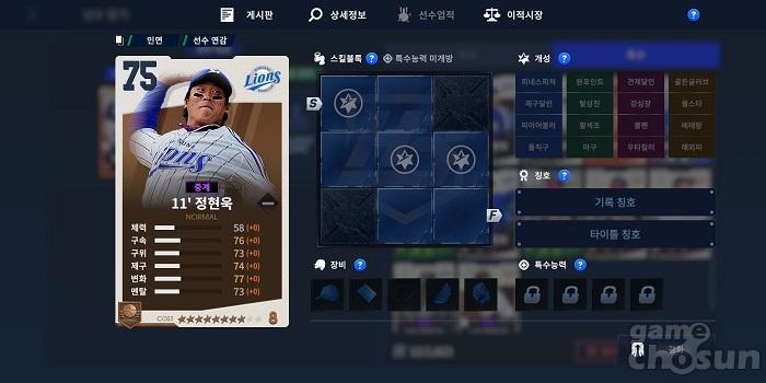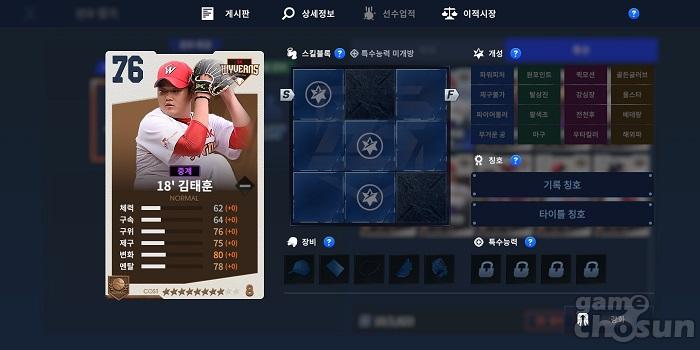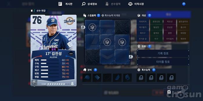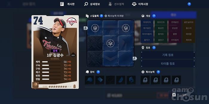 LG의 경우 10'김광수를 추천한다. 김광수는 오버롤 74, 8코스트의 스탯을 가지고 있고, 세부 스탯을 살펴보면 변화 74, 제구 73, 구위 74, 구속 72인걸 확인할 수 있다.