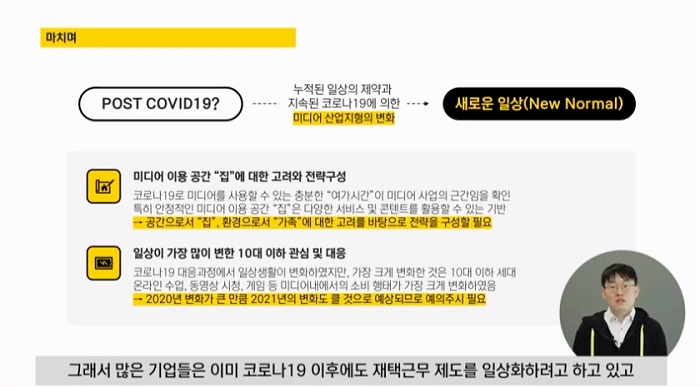 김민석 본부장은 확진자가 급증한 20년 2~3월의 경우 코로나 확산과 미디어 이용량이 추세가 함께 상승하는 모습을 보였다고 말하며, 이는 처음 맞는 코로나19 확산에 대한 공포로 외출을 삼가거나 일찍 귀가하는 등, 집에서 보내는 시간이 늘어난 것이 미디어 이용량 급증의 원인이라고 전했다.