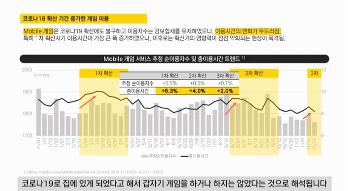 이어서 "이용 시간은 코로나19 확산과 함께 변화하는 모습이 확인된다"라고 말하며 이용 시간 그래프를 토대로 설명을 시작했다. 해당 그래프에 따르면 확산 시기와 관계없이 1% 미만의 증가폭을 보이던 이용자 수와 다르게, 1차부터 3차까지 6.3%, 4.0%, 2.0%의 이용 시간 증가를 확인할 수 있다.