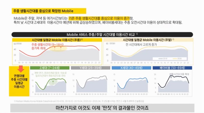 이 중 모바일의 경우 흥미로운 점을 확인할 수 있다. 모바일 이용의 경우 주말 혹은 저녁 같은 여가시간보단 주중 9~18시 즉, 생활시간대를 중심으로 증가하는 추세를 보였다. 김민석 본부장은 이 같은 결과를 두고 "재택근무 및 온라인 수업 중 소위 '딴짓'으로 인한 이용률 증가로 보인다"라며 의견을 제시했다.