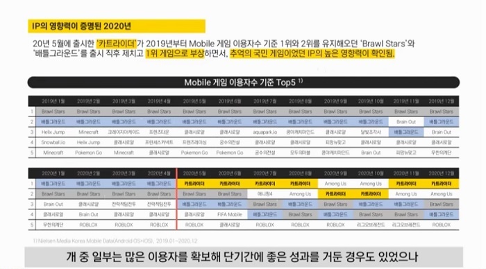 이외에도 김민석 본부장은 카트라이더 IP의 성공에 관해서 언급했다. 김민석 본부장의 설명에 따르면, 19년 이후 브롤스타즈와 배틀그라운드가 1, 2위 자리를 계속 유지해왔다. 그러나 20년 5월 출시된 카트라이더가 돌풍을 일으키며 1위 자리를 차지, 이후 상위권에 머물면서 IP 게임으로서의 성공 가능성을 확인할 수 있었다고 전했다.