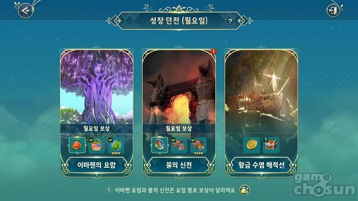 성장 던전은 장비, 이마젠을 강화시키는데 필요한 재료를 수급할 수 있는 콘텐츠로, '이마젠의 요람', '불의 신전', '황금 수염 해적선' 3종의 던전으로 이뤄져 있다.
