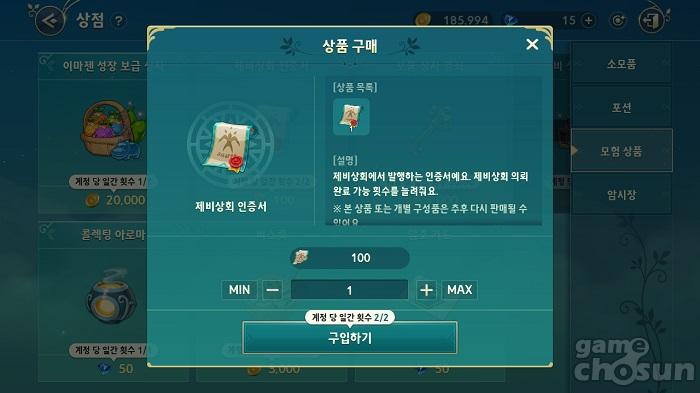 제비상회 의뢰 완료 횟수를 추가해주는 제비상회 인증서 = 게임조선 촬영