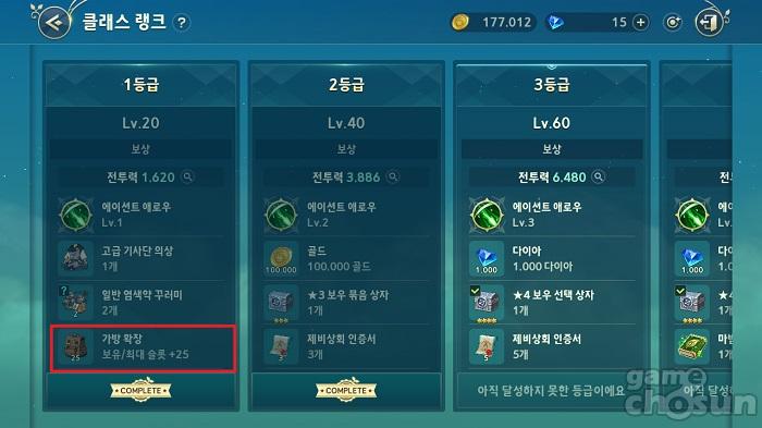 이럴 땐 부캐를 육성하면 된다. 제2의 나라에서 플레이어는 최대 5명의 캐릭터를 육성할 수 있다. 그리고 캐릭터 레벨 20을 달성하면 '클래스 랭크'를 통해 1등급 보상을 획득할 수 있는데, 해당 보상에는 인벤토리 슬롯을 25칸 확장이 포함됐다. 이 방법을 사용하면 부 캐릭터 한 명당 인벤토리 확장에 필요한 375다이아를 절약할 수 있다.