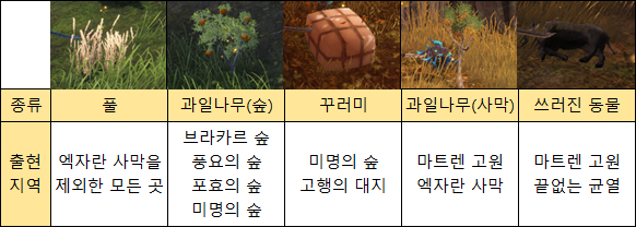 모양별로 수집할 수 있는 재료가 다르며 브라카르 숲부터 끝없는 균열까지 각각 세 종류의 재료를 구할 수 있다. 일부 지역은 재료가 같은 외형을 가지고 있으니 수집하기 전 해당 풀이나 나무를 클릭해 무슨 재료인지 확인하고 수집하면 된다.
