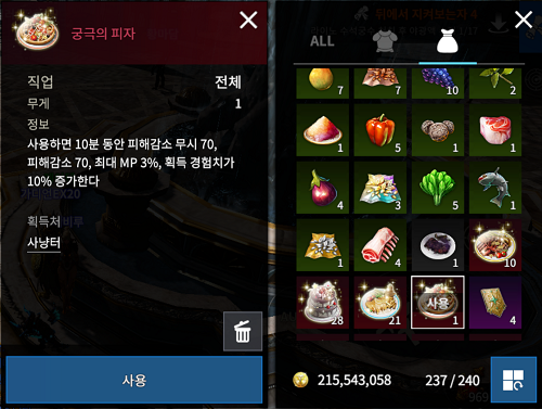 만들어진 요리는 소비 아이템으로 분류되며 공격력, 방어력, HP, MP 등의 능력치를 퍼센트 단위로 올려줘 장비 수준이 높을수록 더욱더 큰 효과를 발휘한다. 특히 모든 요리는 공통적으로 지속시간 동안 획득 경험치를 10% 올려주는 효과를 가지고 있어 조그만 경험치도 놓칠 수 없는 유저라면 필수로 사용해야 한다.
