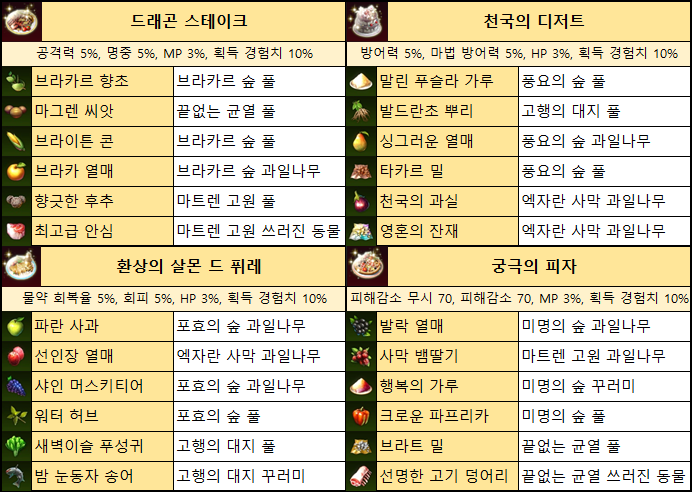 다만 요리를 하기 위해 필요한 재료의 경우 오로지 필드에서 수집해야 하며 습득 장소가 공개되지 않아 직접 요리를 만들고 싶어도 이내 포기하고 거래소에서 다이아를 사용해 구입하거나 요리 사용을 포기하는 경우가 많다. 이에 게임조선에서는 각 요리별 필요한 재료 획득처를 정리해보았다.