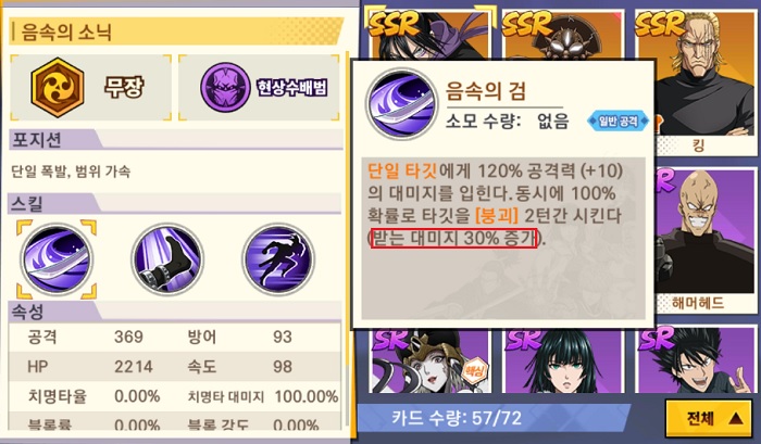 원펀맨: 최강의 남자에서는 SSR, SR, R 등으로 분류되는 다양한 영웅을 등급에 얽메이지 않고 덱의 스타일에 맞게 기용해 운용하게 된다. 일부 영웅은 붕괴', '연소', '부식', '부상' 등의 상태 이상 효과를 보유하고 있으며, 해당 상태 이상 효과를 극대화하는 덱이 게임 내에서 많이 활용되고 있다.