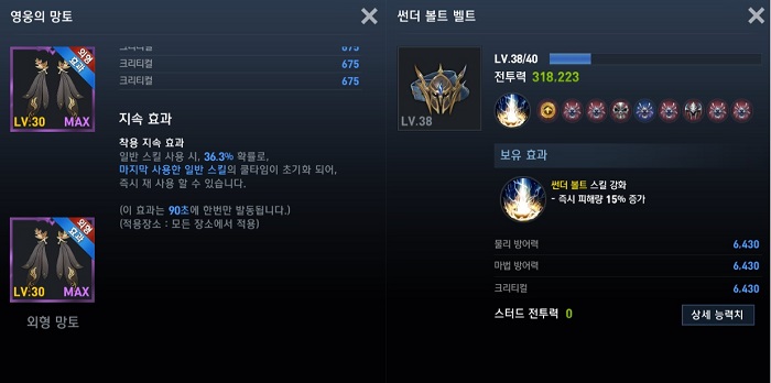 스킬로 말씀을 드리자면 럭키 디펜스 스킬은 공격 1회를 막아주는 보호막(4.28% + 18,590 증가) 효과가 있는데요. 해당 패시브 스킬은 거의 연속으로 발동될 때가 많아서 생존에 큰 도움이 됩니다.