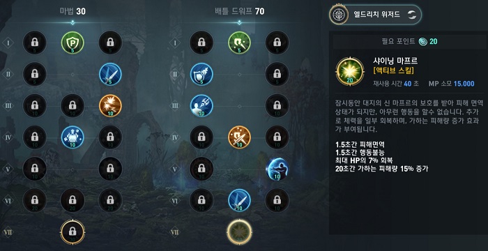 배틀 마스터리는 마법 30과 배틀 드워프 70 비율로 투자했으며, 샤이닝 마프르를 활용합니다. 샤이닝 마프르는 PvP 시에 유용하게 사용할 수 있는 스킬이라서 마스터 했으며 이외에는 평타 데미지와 방어력을 높이는 방향으로 투자했습니다.
