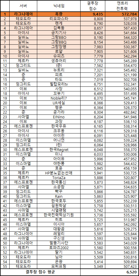 ◆ 각 서버별 결투장 점수 TOP 55 = 결투장 점수 순 정렬