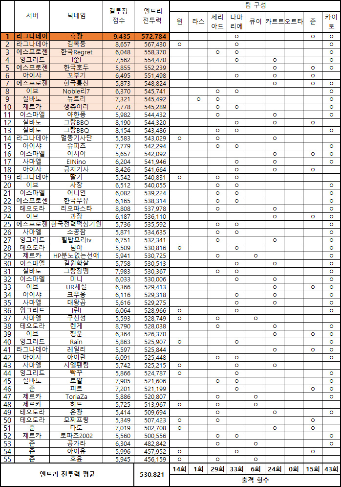 ◆ 전체 서버별 TOP 55 = 엔트리 전투력 순 정렬
