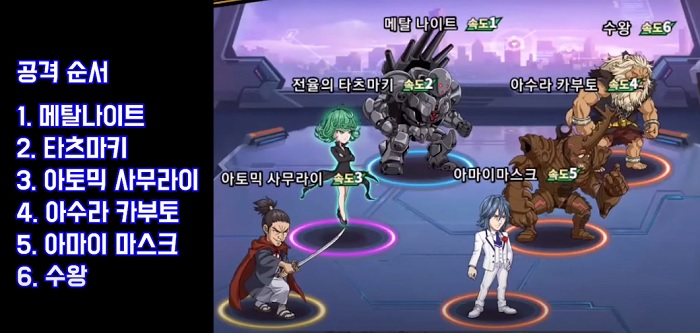 두 번째로 행동하도록 해야하는 영웅은 타츠마키다. 타츠마키 또한 적 전체를 타격하고 부상 효과를 줄 수 있으며, 메탈 나이트가 적에게 부상 효과를 부여했을 경우 타츠마키의 '염동력 충격'으로 타격하면 수왕의 패시브 스킬인 '흡혈 욕망'이 발동돼 추가 피해를 줄 수 있다.
