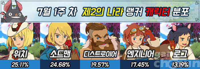 랭커들의 선호 직업은 지난주에 이어 위치가 차지했다. 대신 2위인 소드맨이 불과 0.43%로 지난주보다 더 바짝 쫓는 모양새다. 이 두 직업은 선택률뿐만 아니라 1위를 다수 배출해 랭커들의 최고 인기 캐릭터로 등극했다.