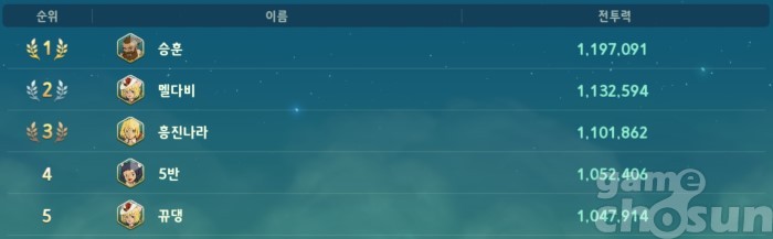 상위 랭커 다섯 명 모두 전투력 100만을 넘긴 제미니 서버 = 게임조선 촬영