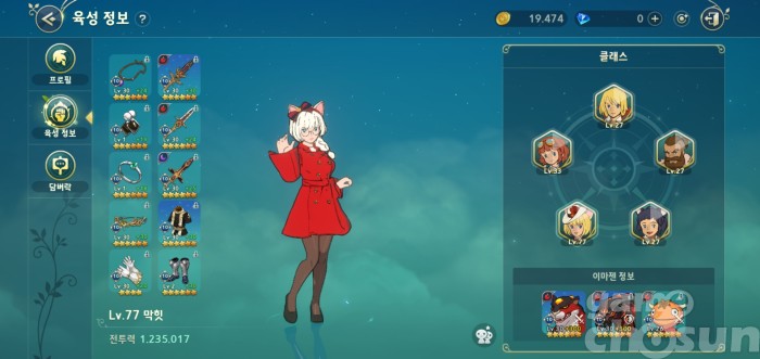 주력 캐릭터인 위치는 77레벨을 달성하며 지난주 대비 8레벨이 상승했으며, 나머지 캐릭터는 27레벨을 유지하고 있는 상태다. 전 서버 2위이자 같은 벨라 서버 유저인 '신한지주'의 주 캐릭터 소드맨이 78레벨, 나머지 캐릭터가 50레벨을 달성한 것과 대조적인 모습이다.