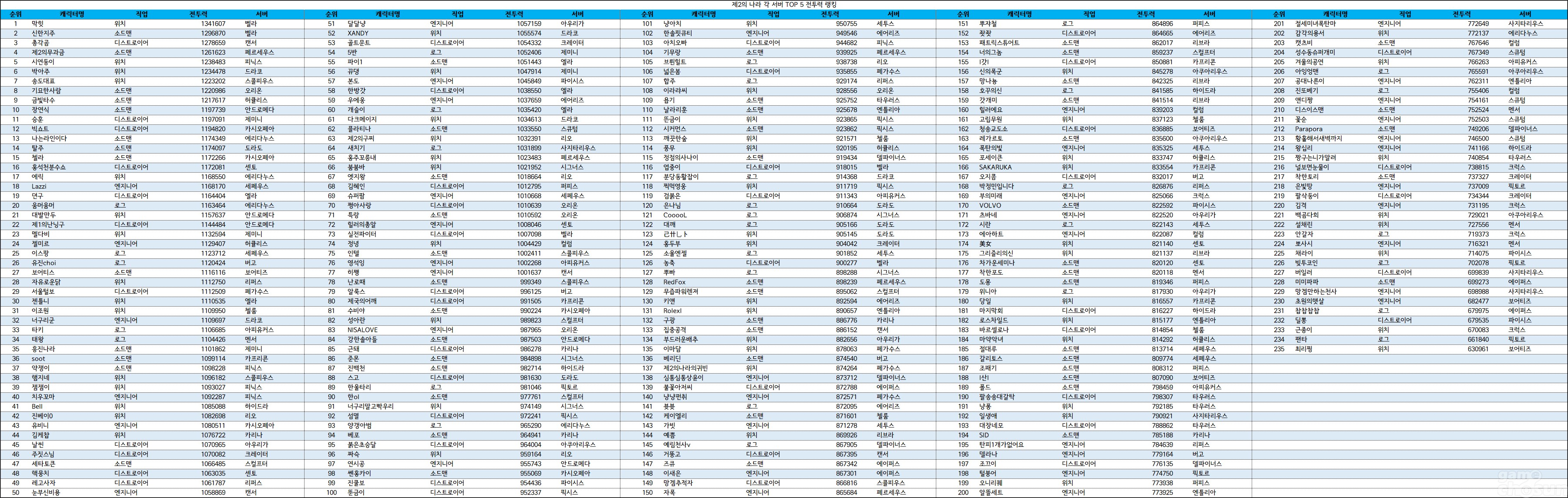 47개 서버 랭커 235명의 전체 순위 표(클릭 시 확대) = 게임조선 작성
