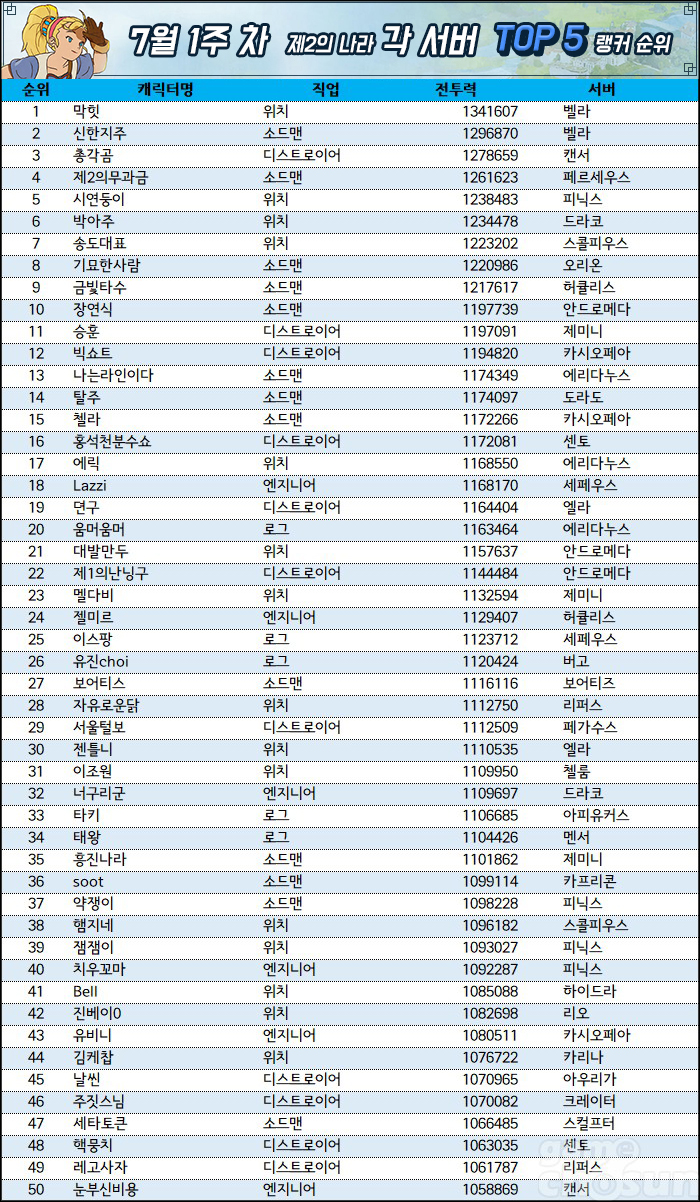 7월 1주 차 전 서버 전투력 랭킹은 많은 랭커가 전투력 100만을 돌파하며 치열한 각축전 양상을 보여주고 있다. 또한 앞서 언급한 바와 같이 벨사 서버 막힛이 전 서버 최초로 전투력 134만을 달성하며 선두에 서있으며, 10위권 안쪽 유저들은 대부분 전투력 120만을 달성했다. 이들의 전투력은 불과 몇 천 차이에 지나지 않기 때문에 다음 회차 랭킹 집계 시 큰 변화가 있을 것으로 보인다.