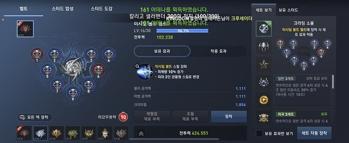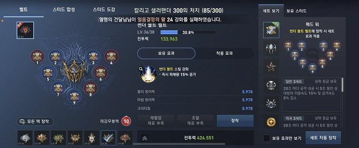 스터드는 높은 등급, 즉 전투력 위주로 장착하기보다는 세트 효과를 받을 수 있게끔 구성해서 사용 중입니다.