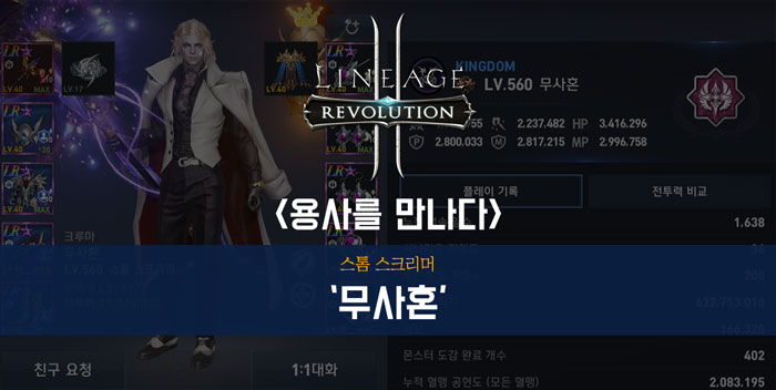안녕하세요. 저는 크루마 서버의 KINGDOM혈맹에서 스톰스크리머를 육성하고 있는 무사혼이라고 합니다.