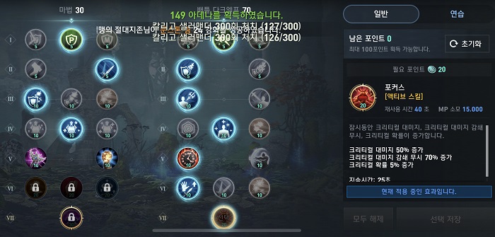 저는 현재 포커스 스킬을 사용하여 크리티컬 대미지 증가, 크리티컬 감쇄 무시 증가, 크리티컬 확률 증가 효과를 쓰고 있습니다. 일반 스킬을 쓸 때 효과를 많이 볼 수 있기 때문이죠.