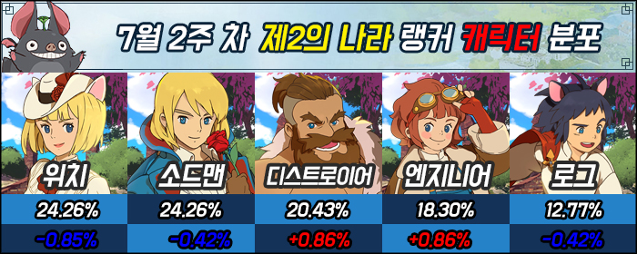 랭커들의 선호 직업은 위치와 소드맨의 선택률이 나란이 하락하면서 24.26%로 동률을 이뤘다. 이 부분을 디스트로이어와 엔지니어가 나눠 가지면서 디스트로이어는 선택률 20%대에 진입했다.